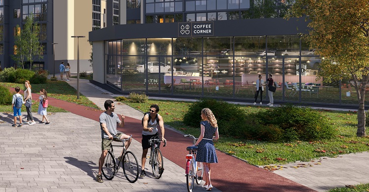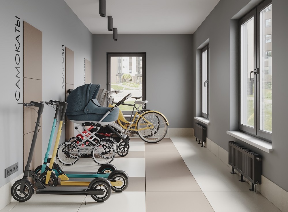 - Общие места хранения для колясок и велосипедов с розетками для зарядки